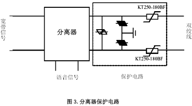 如圖3 所示,通常ADSL 系統(tǒng)中采用的是對線路接口的保護(hù),這種保護(hù)一般將PPTC 熱敏電阻設(shè)計安裝在分離器前,以便實(shí)現(xiàn)對整個系統(tǒng)的保護(hù)。為了獲得安全和可靠的性能,電信網(wǎng)絡(luò)設(shè)備必須符合各地方安全管理機(jī)構(gòu)所要求的配備過電流和過電壓保護(hù)措施的標(biāo)準(zhǔn)。在ADSL 系統(tǒng)中使用的保護(hù)器件的作用就是讓設(shè)備滿足相應(yīng)標(biāo)準(zhǔn)。上海科特高分子材料有限公司型號為KT250-180BF 的PPTC 熱敏電阻符合ITU-T K.20《安裝在電信中心的電信設(shè)備耐電壓和電流的能力》和以該標(biāo)準(zhǔn)為參照的其它標(biāo)準(zhǔn),專用于對ADSL 系統(tǒng)局端設(shè)備進(jìn)行過流保護(hù)(用戶端和局端的分離器電路結(jié)構(gòu)相似,客戶可根據(jù)需要選擇是否進(jìn)行用戶端保護(hù))。