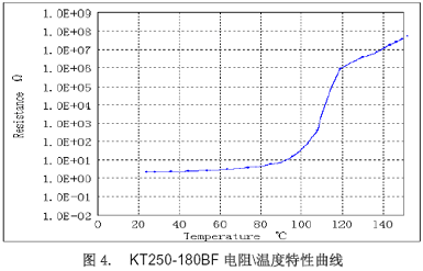 KT250-180BF型高分子熱敏電阻熱容量和動作時間/溫度特性使其動作電流較好的與設(shè)備故障電流匹配,從而縮短了較低故障電流下的動作時間。其主要其性能參數(shù)具體見表1。過電流保護(hù)元器件的動作時間影響著其通過能量和表面溫度,相同的過電流情況下動作時間越快通過能量越小,對設(shè)備的損壞程度就越低。與其它保護(hù)方案相比之下,PPTC 熱敏電阻的反應(yīng)更為迅速,而且保護(hù)后元件的表面溫度比較低,故障電流對其表面溫度的影響較小。由于PPTC產(chǎn)品保護(hù)后電阻變得非常大,能夠通過的電流很小,因而動作后的損耗功率也較小。KT250-180BF型PPTC熱敏電阻的電阻/溫度特性見圖4。