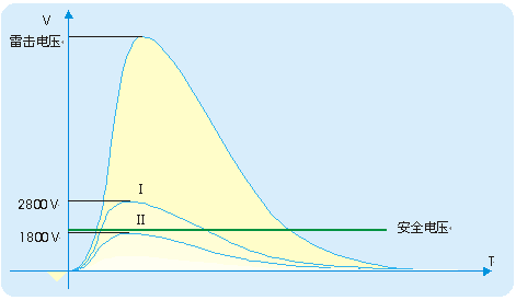 按照國家信息產(chǎn)業(yè)部的要求,電源防雷應按照分級防雷設計。其效果如右圖所示:經(jīng)過二級防雷以后,雷擊電壓降低到對標準通信設備沒有損害的的水平,從而達到保護設備的作用。