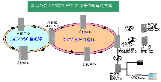 對于大中城市,由于人口居住集中,對數(shù)據(jù)通信的要求也比縣城高,所以在城區(qū)的HFC網(wǎng)采用一級環(huán)形、二級星形的拓?fù)浣Y(jié)構(gòu)。由于城市市區(qū)面積較大,為保證電視信號的傳輸質(zhì)量,可以將城區(qū)劃分為幾個分配中心,分配中心根據(jù)地理位置組成環(huán)形結(jié)構(gòu),每個分配中心均設(shè)在人口密集,住戶集中的地帶,覆蓋約2、3千戶。在環(huán)上,發(fā)射端下行光發(fā)射機(jī)采用HGLT1550ET(必要時加HGFA放大器)沿順時針、逆時針方向同時發(fā)送同一光信號,采用發(fā)端并發(fā)、收端用光開關(guān)切換的工作方式,使環(huán)路具備雙向的自愈能力。