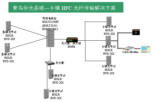 在較小的縣城中,HFC光纖傳輸組網(wǎng)可選用星樹形混合組網(wǎng)方式。對于距離近的光節(jié)點(diǎn)可采用HGLT1310系列光發(fā)射機(jī)方式傳送下行信號,對于距離遠(yuǎn)的光節(jié)點(diǎn)采用HGLT1550ET和HGFA放大器結(jié)合的方式傳送下行信號。接收端全部采用HGLR1310、1550通用型光接收機(jī)。對于需要圖像、數(shù)據(jù)回傳的光節(jié)點(diǎn)采用RVD-XX光回傳發(fā)射機(jī),在縣城有線電視臺用RVM-2或RDM-2回傳接收機(jī)接收回傳信號。這樣就組成了一個經(jīng)濟(jì)實用、易于升級、集圖像和數(shù)據(jù)傳輸于一體的寬帶有線電視傳輸平臺。