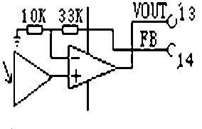 ISO 1001 為用戶設計了一個輸出放大器,其原理如圖七 所示,FB為放大器的反相輸入端,當13和14腳短接時,輸出放大倍數Kout=1+33/10=4.3,由于隔離放大器部分已有2.35倍的放大倍數,所以,總放大倍數K=4.3*2.35=10.1。
