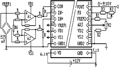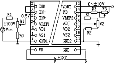 圖三、為ISO 系列隔離放大器典型應用接線原理圖,其中輸入和輸出放大器都為跟隨方式。 此時隔離放大器的整體放大倍數為20倍,R1,R2和W1為調零電路,R1=5.1K R2=2K W1=2K(多圈電位器)。 輔助電源為 +12VDC,R3和W3為增益調節電路,R3=39K W3=10K(多圈電位器)