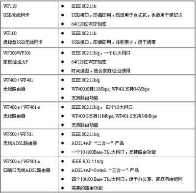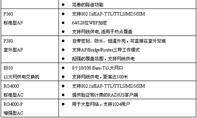 WLAN的應(yīng)用領(lǐng)域簡單講可以分為三大部分:家庭/Soho應(yīng)用,行業(yè)應(yīng)用,以及各大電信運(yùn)營商大力推展的公共熱點覆蓋,這些領(lǐng)域?qū)Ξa(chǎn)品的規(guī)格、性能、功能都有相當(dāng)不同的要求。作為以通信產(chǎn)品的設(shè)計和制造為支撐業(yè)務(wù)的廠商,中達(dá)電通向用戶或系統(tǒng)集成商提供全系列的WLAN產(chǎn)品,這其中包括具有時尚造型的家庭型AP WF300,包括ADSL/AP二合一的“無線A貓”WF500,包括用于熱點覆蓋的室內(nèi)型AP P360、室外型AP P380等等。詳細(xì)產(chǎn)品系列如下表所列,其中,除了已經(jīng)大量商用的11M的IEEE 802.11b產(chǎn)品以外,還包括全系列54M的IEEE 802.11g產(chǎn)品。