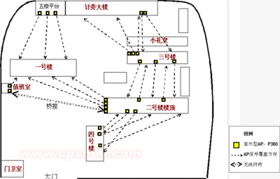 如圖所示,在二號樓、三號樓和紀(jì)委大樓這三個樓頂放置P380多的樓內(nèi),放置以太網(wǎng)供電交換機(jī),對于值班室和四號樓采用以太網(wǎng)供電模塊進(jìn)行供電。P380還具有橋接功能,對于不方便布放網(wǎng)線的地方,可以利用P380的橋接功能進(jìn)行接入。在本方案中,由于值班室不方便拉網(wǎng)線,所以采用P380的橋接功能,先是采用一對AP從二號樓橋接到值班室,再通過另一個AP對一號樓的一部分區(qū)域進(jìn)行覆蓋。