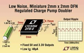 凌特公司(Linear Technology)日前推出采用2×2mm DFN封裝的穩壓充電泵——LTC3204。該器件具有低噪聲和恒定頻率(1.2MHz)工作特點。LTC3204-3.3可從1.8V的最小輸入電壓(2節AA堿性/鎳氫電池)產生3.3V輸出電壓,而輸出電流可達50mA;LTC3204-5則可從2.7V的最小輸入電壓(鋰離子電池)產生5V輸出,而輸出電流達150mA。