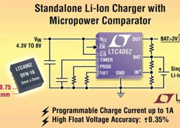 凌特公司(Linear Technology)推出集成了微功率比較器的緊湊型獨立線性單節鋰離子電池充電器——LTC4062。它具有保證充電安全性的多種功能、更高的充電終止靈活性、更詳細的狀態報告和更長的電池壽命等特性,適合于從墻上適配器或USB對MP3播放器、數碼相機、PDA和蜂窩電話中的電池充電。