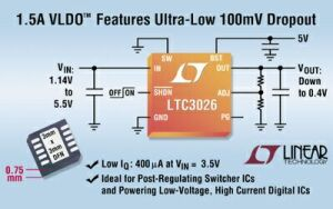 凌特公司(Linear Technology)推出輸入電壓低至1.14V的1.5A超低壓差(VLDO)線性穩壓器——LTC3026。該器件可工作于0.4V至2.6V的可調超低輸出電壓范圍,在提供高達1.5A輸出電流的同時,還能保持僅為100mV的極低壓降。