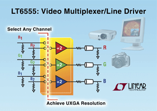 LT6555 同樣非常適合用做前端接收器或輸出電纜驅(qū)動器,這是在 UXGA LCD投影機和監(jiān)視器或等離子體顯示器中切換 RGB 信號、在專業(yè)視頻設備和高保真多輸入視頻轉(zhuǎn)換應用中實現(xiàn)信號布線的極佳器件。