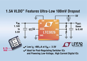 凌特公司(Linear Technology)推出輸入電壓能低至 1.14 V 的 1.5A 非常低壓差(VLDOTM)線性穩壓器 LTC3026。該器件可工作于 0.4V 至 2.6V 的可調超低輸出電壓范圍,在提供高達 1.5A 輸出電流的同時,還能保持僅為 100mV 的極低壓降。為了工作于低輸入電壓,LTC3026 具有一個為內部 LDO 電路提供必需空間的集成升壓轉換器。如果系統沒有提供外部 5V 電壓軌,這一功能可確保用戶具有能使用更低輸入電壓的靈活性。LTC3026 的高電源抑制能力使其成為用于開關電源的高效后穩壓器。其它關鍵應用包括從低輸入電壓 2.5V/1.8V/1.5V 軌的高效率線性穩壓,還有可為微控制器、微處理器、PLD/FPGA 和 DSP 等低壓大電流數字 IC 供電。