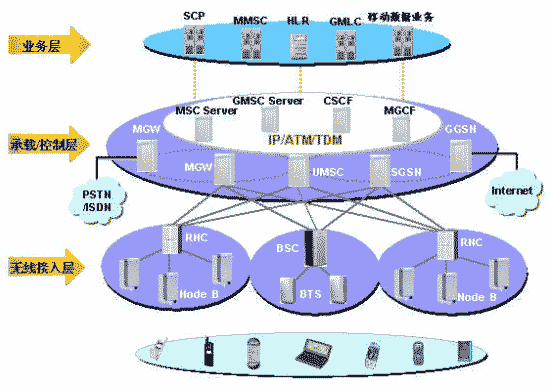 無線接入層:實現各種終端的接入功能,包括GSM/GPRS的無線接入和WCDMA的無線接入及以后全IP的無線接入。