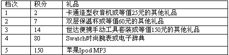 例如:您擁有150個積分,可以換領Ipod MP3一個;也可換領Swatch時尚腕表或電子辭典一個(80分)+5個世達便攜手動工具套裝(70分)。
