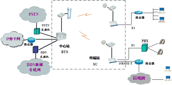 以下是中興通訊針對(duì)集團(tuán)用戶需求,采用ZXBWA-3E為運(yùn)營商提供的一攬子解決方案。ZXBWA--3E無線接入系統(tǒng)支持基于E1的電路業(yè)務(wù)、N*64Kbps數(shù)據(jù)專線業(yè)務(wù)和IP數(shù)據(jù)業(yè)務(wù)。通過增加外圍設(shè)備,如PBX交換機(jī)、UAS、以太網(wǎng)交換機(jī)、路由器、G.703/V.35轉(zhuǎn)換器等,系統(tǒng)可以通過提供PBX連接,因特網(wǎng)接入,會(huì)議電視等為集團(tuán)用戶提供綜合業(yè)務(wù)。組網(wǎng)如圖所示: