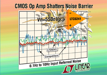 7月11日北京訊,凌特公司(Linear Technology)推出一系列具有像雙極型放大器那樣低的電壓噪聲的新型 CMOS 放大器。CMOS 放大器通常以低輸入偏置電流而聞名,但本身比雙極型設計的噪聲高。LTC6241 雙路和 LTC6242 四路放大器消除了這一基本性能缺陷。這些放大器在 0.1Hz 至 10Hz 區域具有卓越的 550nVP-P 低噪聲,其電壓噪聲比現有 CMOS 放大器少 3 倍。這種性能突破不能從以前的 CMOS 放大器上獲得,由于有了這樣的性能,所以可在多種需要高阻抗輸入的高端儀表、醫療和通信應用中實現最高信號分辨率。