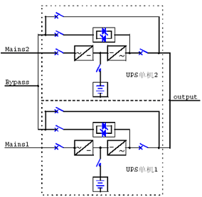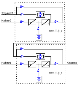 用兩臺單機系列的UPS串聯運行。即一臺作為主機,另一臺的輸出接到主機的旁路輸入端,作為備用機。由于單機系統的價格一般較并機系統的低,整體配置成本較低,系統主UPS工作,承擔所有負載,另一臺處于待機狀態,當主UPS故障時,自動轉到備用UPS供電。串聯熱備份系統是通過UPS 的串接實現冗余,串聯熱備份系統一般適用于兩臺UPS 的場合。
