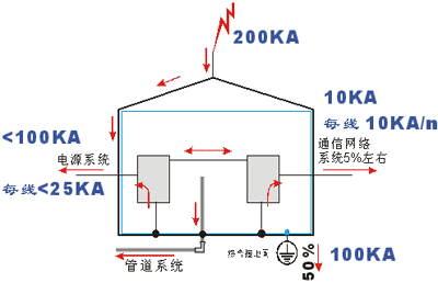 一個能量為200KA的直擊雷,由整個系統(tǒng)的電源、管線、地網(wǎng)、通信網(wǎng)絡(luò)線來分擔。以一棟建筑的防雷來講,電源部分承擔其中近45%(100KA),以三相四線為例,每線承擔大約有25KA(10/350us)的雷電流。通信站基本無管道系統(tǒng),不計。地網(wǎng)和通信線路承擔剩余55%的雷電流。由此可見,電源系統(tǒng)對直擊雷的防護非常關(guān)鍵。