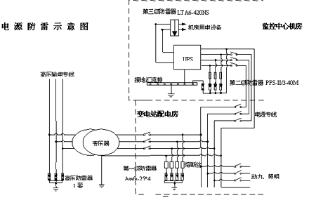 * 在監(jiān)控中心機房的220V電源的電源進線端,安裝通流容量40KA電源防雷器1套,三相線路推薦型號是PPS-II/3-40M防雷箱;單相線路推薦型號是PPS-I/1-40M防雷箱,作為監(jiān)控中心機房設(shè)備電源第二級防護。