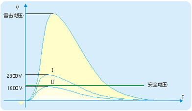 按照國(guó)家信息產(chǎn)業(yè)部的要求,電源防雷應(yīng)按照分級(jí)防雷設(shè)計(jì)。其效果如右圖所示:經(jīng)過二級(jí)防雷以后,雷擊電壓降低到對(duì)標(biāo)準(zhǔn)通信設(shè)備沒有損害的的水平,從而達(dá)到保護(hù)設(shè)備的作用。
