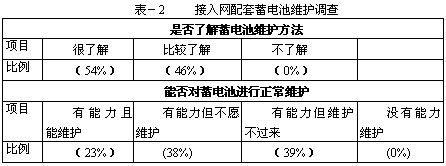 目前接入網配套12V蓄電池大多是內置到主設備機柜的最下層,日常接入網維護有時會忽視對電池的檢查。我們通過問詢調查的方式獲得有關接入網內置電池的維護情況(表-2)。可以看出,用戶對蓄電池維護方法不但非常了解而且具有豐富經驗,但在接入網電池維護人員配置以及維護實施方面尚存在一定薄弱環節,目前能自行維護的比例只占到23%,不能顧及的比例高達近80%。