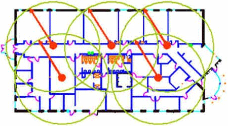 設(shè)計(jì)方案一般根據(jù)經(jīng)驗(yàn)確定單天線覆蓋半徑,估計(jì)覆蓋范圍,功率設(shè)計(jì)難度很大。設(shè)計(jì)結(jié)果和覆蓋效果可以參看以下二圖。