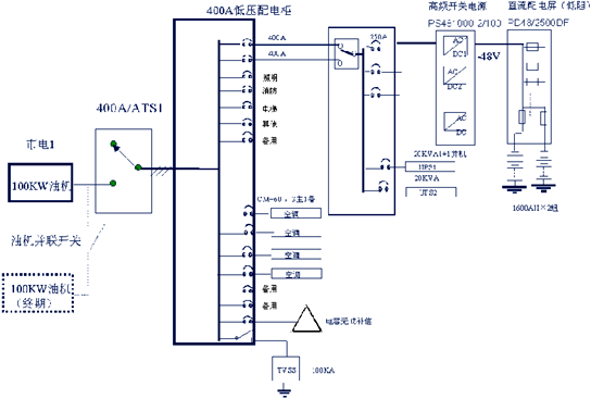 圖為一個典型的中小型交換局及基站的供電方案的供電原理圖。此類局站一般為一路市電輸入,初期配備一臺油機,終期可能會擴展第二臺油機,但與大型交換局站方式不同,這里不再采用 ATS的切換方式,只是用一個油機并聯開關進行兩臺油機的切換;另外,對于小型的局站或基站有可能將交流配電、直流配電等同整流器一起集成在一個機柜內。對交/直流不間斷的電源系統仍然由單獨的交流配電柜進行配電,機房精密空調則由第一級的低壓配電柜進行供電。