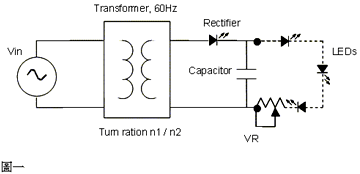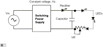 如圖一所示,這種提供LED電源的方式非常簡單只需一個低頻變壓器,整流器,濾波電容還有一個用來調整亮度的可變電阻。串聯LED的數目主要由變壓器的圈數比所決定。一旦選用圈數比固定之后若要得到一樣的亮度,就很不容易改變LED的數目。只能夠藉由并聯的方法增加LED的數目,但這種電源架構很不容易做到并聯的LED有相同的亮度。