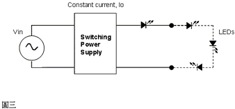 如圖三所示,屬于定電流的電源供應器,輸出電流可調整非常適合LED照明的應用。因為沒有額外的可變電阻VR,所以電源使用率比前兩種方案高些。在LED的串聯使用上非常方便,因為流經LED的電流固定不受LED數目的影響。對于LED的并聯使用仍無法保證并聯路徑LED的均流效果。