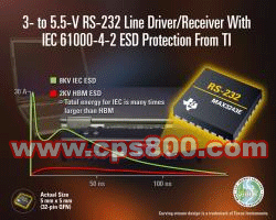 德州儀器(TI)宣布推出具有系統級IEC 61000-4-2 ESD(靜電)保護功能的新型RS-232器件。在這些器件中集成IEC 61000-4-2保護使RS-232接口在系統運行期間能夠抵御靜電沖擊的損害,如在系統啟動后連接至RS-232電纜的情況下。這些器件的另一顯著優勢是消除了外接 IEC ESD保護器件,從而可顯著節省板級制造商的組裝成本及板級空間。TI具有IEC ESD保護功能的首批器件包括:MAX3243E、MAX3232E與MAX3227。