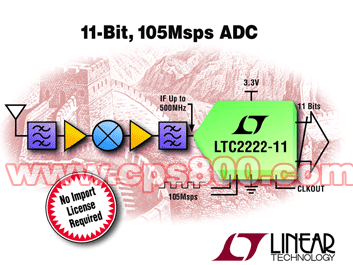 LTC2222-11 與凌特公司的 10 位和 12 位高性能 ADC 系列引腳兼容,這包括了 LTC2222(12 位、105Msps) 和 LTC2224(12 位、135Msps),從而提供了升級途徑。因為 LTC2222-11 進口中國不需要許可證,所以在 12 位 ADC 進口許可證獲得批準之前,它還可以用來設(shè)計原型產(chǎn)品。