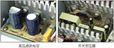 在高壓濾波方面這款產品選用了2顆220V330uF的規格的電容,這對于功耗在230W左右的網吧整機來說,完全夠用。開關變壓器是傳遞功率的部分,變壓器的直徑、高度和磁芯的材料都會影響到功率輸出大小。網吧精靈(ATX3500-L)選用了做工優良的高規格元件。