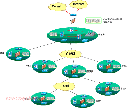 隨著國家對“校校通”工程的推進,利用先進的技術,將各高校、教委、各中小學通過計算機網絡連接起來,實現教育信息化的需求越來越緊迫。教育城域網可以采用千兆或萬兆作為網絡核心來提高整個網絡的吞吐量,市教委核心骨干網絡采用高性能、機架式、模塊化的高端路由交換機,具備大容量、高性能的線速的L2/L3/L4交換能力,支持豐富的單播/組播路由協議,具備強大的安全功能,支持ACL過濾機制,支持MPLS、二層、三層MPLS VPN、NAT、QOS、帶寬控制、可控組播等高級功能,具備抗病毒機制,關鍵設備采用設備冗余,鏈路冗余設計。根據實際的物理資源和地域分布,采用不同的方式將學校接入城域網;對于較近的學校,可以利用光纖就近直接接入城域網;對于無法直接接入城域網的學校,可以利用運營商網絡進行接入;對于邊遠地區的學校可以利用微波等手段接入城域網。各學校按照各自的規模構建相應的校園網。網絡中心采用統一網管對網絡設備進行全網的管理和監控,對外出口采用硬件防火墻對全網進行安全防護,保證數據的安全和完整性。