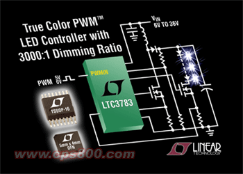 凌特公司(Linear Technology Corporation)推出電流模式多拓撲轉換器 LTC3783,該器件具有恒定電流 PWM 調光功能,用于驅動大功率 LED 串和組。專有技術提供極快的真正 PWM 負載切換,無瞬態欠壓或過壓問題。3000:1 的調光比可以數字方式實現,真正彩色 PWMTM (True Color PWMTM)調光保證白光和 RGB LED 的顏色一致性。LTC3783 允許采用模擬控制實現額外的 100:1 調光比。這種通用控制器可以用作升壓、降壓、降壓-升壓、SEPIC 或反激式轉換器以及恒定電流/恒定電壓調節器。無檢測電阻(No RSENSETM)工作模式利用 MOSFET 的接通電阻以去除電流檢測電阻,從而提高了效率。LTC3783 的應用包括電信、汽車和工業控制系統中的高壓 LED 陣列和背光照明以及穩壓器。