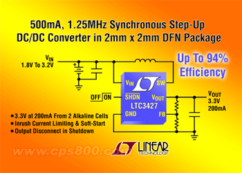 凌特公司(Linear Technology Corporation)推出 1.25MHz、電流模式、同步升壓型 DC/DC 轉換器 LTC3427,該器件采用 2mm x 2mm DFN-6 封裝,具有真正輸出斷接、浪涌電流限制和集成軟啟動功能。它的內部開關從 1.8V 至 5V 的輸入電壓范圍提供 500mA 電流限制(最。┖透哌_ 5.25V 的輸出電壓,使該器件非常適用于鋰離子電池和雙節堿性/鎳氫金屬電池應用。LTC3427 從兩節堿性電池提供高達 200mA 的持續輸出電流(在 3.3V時)。其同步整流實現了高達 94% 的效率。此外,1.25MHz 的恒定開關頻率最大限度地降低了開關噪聲,并允許使用纖巧的低成本電感器和電容器。其 2mm x 2mm DFN 封裝和纖巧的外部組件為電池供電的手持應用提供了一個非常緊湊且小占板面積的扁平解決方案。