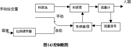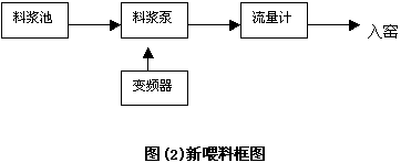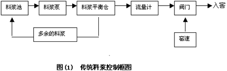 在濕法水泥窯煅燒過程中,窯尾料漿的喂料控制是至關重要的一環,它直接關系到水泥熟料的產量和質量。傳統的喂料控制方式有兩種(1)勺式喂料:單位勺的容積一定,通過調節直流電機轉速來控制喂料量,這是老濕法窖普遍喂料方式,計量較準,但控制較復雜;(2)采用閥門調節,用電磁流量計進行計量的方式,這是近幾年發展起來的喂料方式,控制較簡便,但閥門執行器頻繁動作,易出故障。以上兩種方式料漿泵都是以工頻恒速運行的。如圖(1)所示為第二種喂料的框圖(第一種把流量計和閥門換為勺式機),