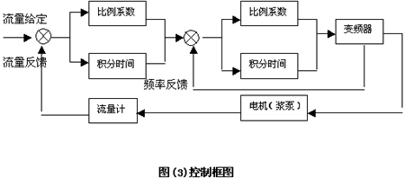由于我廠使用DCS過程控制系統,這為實現喂料的手、自動控制帶來了方便,手、自動切換和控制算法由DCS系統實現,變頻器作為執行器,采取雙閉環控制方式,如圖(3),外環為流量控制環,內環為變頻器頻率控制環;DCS系統接受實際流量信號和變頻器的頻率信號。設定流量與實際流量的偏差經運算后作為變頻器的頻率設定信號,與變頻器的實際頻率信號比較,運算結果作為變頻器的實際頻率信號。由于料漿泵有30多米的揚程,變頻器低于31HZ時抽不出漿,而到39HZ時就達到最大流量60方,所以我們限定了變頻器的運行頻率,調節范圍為31HZ到39HZ,它和DCS系統送出的0~10V頻率信號對應。