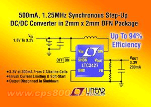 LTC3427從兩節(jié)堿性電池提供高達(dá)200mA的持續(xù)輸出電流(在3.3V時)。據(jù)稱,其同步整流實(shí)現(xiàn)了高達(dá)94%的效率。此外,1.25MHz的恒定開關(guān)頻率最大限度地降低了開關(guān)噪聲,并允許使用纖巧的低成本電感器和電容器。其2mm×2mm DFN封裝和纖巧的外部組件為電池供電的手持應(yīng)用提供了一個非常緊湊且小占板面積的扁平解決方案。