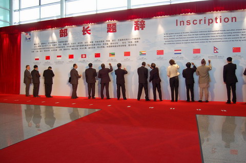 上圖為上午9:20,深圳會展中心6樓茶花廳,20米長的大型題詞紀(jì)念墻前,來自11個國家21位部長在所屬國家的國旗下題詞簽名,用本國文字留下了對第八屆高交會和中國、深圳的美好祝福。