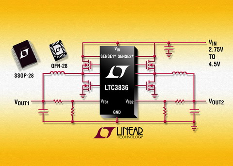 照片說明:雙輸出、低輸入電壓、兩相、無檢測電阻同步控制器LTC3836