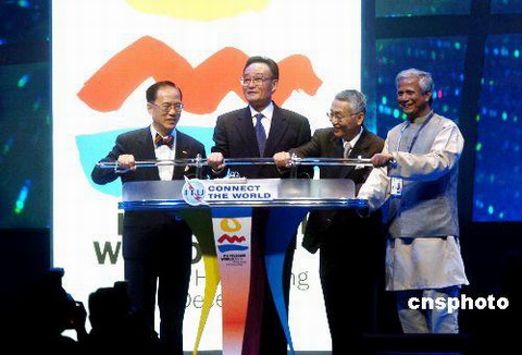 全國(guó)人大常委會(huì)委員長(zhǎng)吳邦國(guó)(左2)﹑香港特首曾蔭權(quán)(左1)﹑國(guó)際電信聯(lián)盟秘書(shū)長(zhǎng)內(nèi)海善雄(左3)﹑孟加拉國(guó)鄉(xiāng)村銀行總經(jīng)理﹑諾貝爾和平獎(jiǎng)獲得者穆罕穆德·尤努斯一起為電信展揭幕。