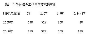 半導(dǎo)體工藝等級在未來十年將從0.18微米向50納米工藝邁進(jìn),芯片所需最低電壓最終將變?yōu)?.6V,但輸出電流將朝著大電流方向發(fā)展。據(jù)市場調(diào)查得知,隨著半導(dǎo)體工藝的發(fā)展,半導(dǎo)體對各種電壓的需求百分率走勢為(見表1):