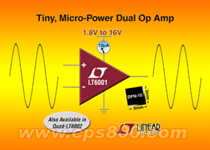 凌特公司推出業界第一個采用纖巧 DFN 封裝的 1.8V 雙路和四路運算放大器 LT6001 和 LT6002。這些微功率器件的每個放大器僅消耗 1.3uA 電流,并具有卓越的性能。在 25oC 時最大輸入失調電壓為 500uV,而在整個溫度范圍的最大電壓漂移為 5uV/oC。并具軌至軌輸入和輸出運作工能。