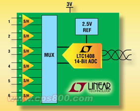 LTC1408采用3條輸入選擇線配置被轉換的差分輸入數量。因此較高速度是可能的,從一個在 600ksps的差分輸入到6個在100ksps的差分輸入。6個轉換結果通過一個3線接口順序提供給高速DSP 串行端口。這個ADC還具有一個單獨的數字輸出電源引腳和一個雙極/單極引腳,以選擇±1.25V雙極或0V至2.5V單極輸入范圍。