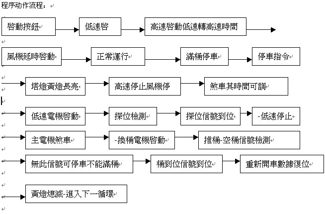 滿桶后,圈條盤出口自動定位,主機停車,依次換桶電機啟動帶動弧形推桶板推出滿桶、斷條、推桶板退回;轉臂電機啟動使轉臂向下旋轉90°;推動電機再啟動,通過轉臂將滿桶繼續外推;補桶電機通過傳動由撥盤將空桶送至預定位置,撥盤退回;推動電機經轉臂將空桶拉到底盤上;轉臂電機使轉臂上旋90°,最后主電機啟動。完成全部換桶過程只需30多秒。該過程由PLC控制,保證了換桶的可靠性。