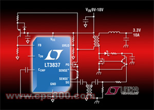 凌特公司(Linear Technology Corporation)日前推出同步反激式DC/DC控制器LT3837,該器件用于10W至60W的隔離電源,具有精確的調節能力和高效率。這個控制器集成電路可用9V~36V的輸入電壓工作,非常適用于工業和儀表應用。LT3837是一款電流模式控制器,可通過變壓器繞組來檢測副端電壓,并據此來調節輸出電壓。這允許不使用光隔離器而對輸出電壓進行精準調節,從而改善了動態響應和系統可靠性。同步整流提高了轉換效率并改善了多個輸出電源時的輸出互調。例如,采用LT3837以高達90%的效率和±1%的精確調節將9V至36V的輸入電源轉換為一個3.3V/12A的隔離輸出。