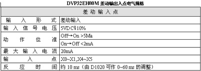DVP32EH00M之X0~X1及X4~X5均為DC5V高速輸入電路(其余為DC24V輸入)。此高速輸入電路工作頻率可達200kHz,主要是用以連接差動(雙線式) LINE DRIVER輸出電路用,也可使用單端之DC5V SINK/SOURCE輸入,或?qū)⒅兂蓡味酥瓺C24V SINK/SOURCE輸入,這也解決了某些特殊傳感器低電壓(DC5V)時無法由PLC采集其狀態(tài)的問題。