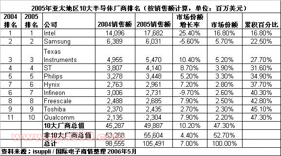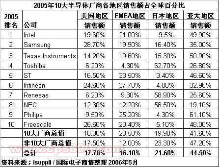 英特爾、三星電子和德州儀器這三家全球最大的半導體供應商,在2005年繼續控制全球市場,在所有地區均占有最大的市場份額。在所有上述三個地區中,這三家廠商都位居10大廠商之列。