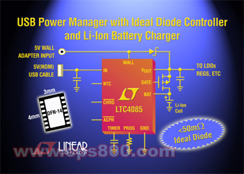 5月25日北京電 凌特公司推出用于便攜式 USB 裝置的單片自主電源管理器、理想二極管控制器和獨(dú)立電池充電器 LTC4085。該器件具有電源通路(PowerPathTM)控制功能,可為 USB 外圍設(shè)備提供電源,并從 USB VBUS 或墻上適配器電源為該外圍設(shè)備的單節(jié)鋰離子電池充電。為了滿足 USB 限流規(guī)格要求,當(dāng)系統(tǒng)負(fù)載電流提高時(shí),LTC4085 自動(dòng)降低電池充電電流。為確保總線連接時(shí)完全充電的電池仍然保持滿電量,該集成電路通過 USB 總線直接向負(fù)載供電而不是從電池吸取功率。一旦去掉電源,電流就通過內(nèi)部 200mΩ 低損耗理想二極管從電池流向負(fù)載,從而最大限度地減小壓降和功耗。提供了用于驅(qū)動(dòng)一個(gè)可選外部 PFET 連接的板載電路,以便在應(yīng)用需要的情況下把理想二極管的總阻抗降至 50mΩ 以下,從而實(shí)現(xiàn)較高的工作效率。