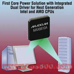 MAX8809A單芯片、2相方案集成驅動器,為功率需求高達65W的應用提供理想的解決方案。片上還包括第3相PWM輸出,因此經過簡單調整即可滿足更大功率的需求;僅僅增加一個MAX8552高性能驅動器即可支持高達90A的設計。MAX8810A集成了雙路驅動器,同時還額外增加了2路PWM輸出。MAX8810A與高性能雙路驅動器MAX8523配合使用,能夠為高達150A的4相設計提供低成本、結構緊湊的2芯片方案。MAX8809A采用無鉛、5mm × 5mm、40引腳、薄型QFN (TQFN) 封裝,MAX8810A采用無鉛、6mm × 6mm、48引腳TQFN封裝。MAX8809A和MAX8810A的起價分別為$2.40和$2.50 (1000片起,美國離岸價)。Maxim公司電話:010-62115199,傳真:010-62115299,網址:http://www.maxim-ic.com。