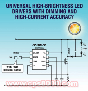 Maxim推出具有寬輸入電壓范圍的高亮度 (HB) LED驅動器MAX16801/MAX16802。MAX16801適合通用的交流輸入 (85V至265V交流電壓整流輸入)LED驅動器,MAX16802則適用于直流輸入LED驅動器 (10.8V至24VDC,采用外部偏置時輸入電壓可以更高)。MAX16801/MAX16802具有262kHz固定開關頻率,采用電流模式控制方案。配合使用外部MOSFET,可提供大功率輸出 (超過50W),并可獲得較高效率(85%以上)。允許使用小尺寸元件,從而降低了系統成本。可以驅動幾路串聯的HB LED,通過PWM或線性亮度調節實現較寬 (0至100%)的調節范圍。需要精確調節LED電流時,可利用內部誤差放大器和精度為1%的基準進行調節。這些器件非常適合buck、boost、SEPIC、隔離或非隔離反激拓撲,典型應用包括:照明系統、裝飾燈、建筑照明、顯示器背光以及其它恒流驅動LED產品。