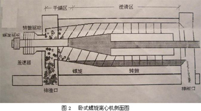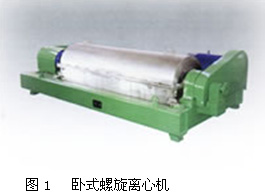 臥式螺旋離心機(簡稱臥螺離心機)如圖1,廣泛應用于石油、化工、冶金、醫藥、食品、輕工等部門。即可用于固體脫水和分級,也可用于液體的澄清,在離心機領域占有重要地位。由于這種離心機具有單機處理能力大、操作方便、能連續自動操作、勞動強度低、占地面積少以及維護費用低等優點,所以自五十年代以來,螺旋離心機在污泥脫水中得到廣泛應用,逐漸取代其他脫水機械成為大型城市污水處理廠污泥脫水的首選設備。懸浮液通過在螺旋輸送器中心的進料管進入高速旋轉的轉鼓內,由于離心力的作用,較重或較大的顆粒被拋向旋轉的轉鼓內壁,通過螺旋小端的噴射孔噴出轉鼓,而較輕的固體顆粒及液相通過轉鼓大頭的溢流孔溢出轉鼓。懸浮液由一臺可實現無級調速的螺桿泵進料。